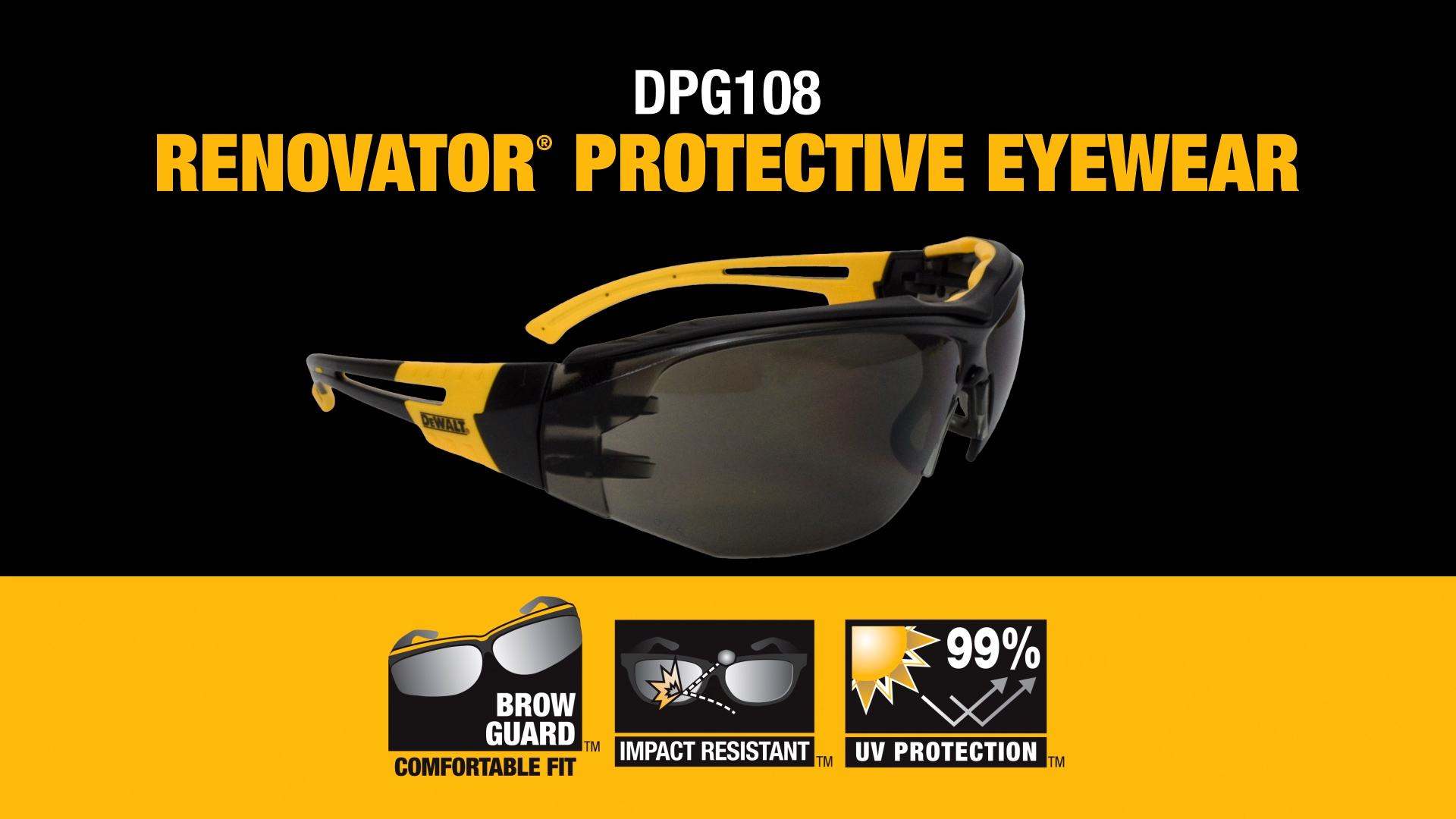 The wrap-around design of the DEWALT Renovator® provides superior protection, and the innovative TPR padded brow guard prevents jobsite debris falling behind the lens.