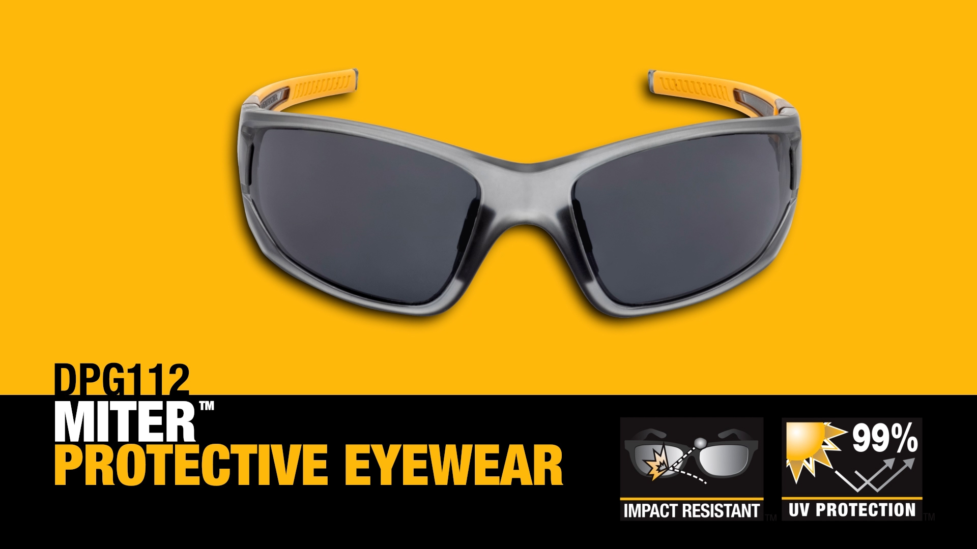 The DEWALT DPG112 Miter® protective eyewear boasts a full-frame design with rubber overmolded flexible temples for a comfortable and secure fit during extended wear. Side vented lenses and temples promote air flow to help address fogging and a rubber nosepiece prevents slippage even in dynamic work environments. A neck cord (not included) attachment point allows users to conveniently secure the glasses when not in use.