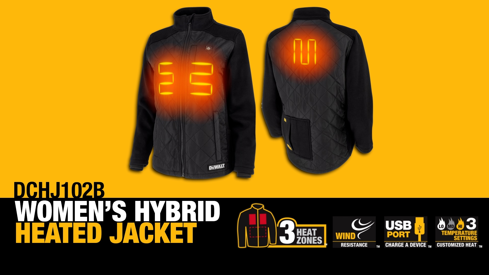The DEWALT DCHJ102 Women's Hybrid Heated Jacket provides up to 9 hours of warmth. This jacket is functional and stylish with a wind-resistant quilted polyester shell and knit shoulders and sleeves. The soft polyester fleece liner provides extra warmth and the taffeta-lined sleeves make it easy to put on and take off. Multiple secure zipper pockets provide ample storage for accessories and more.
