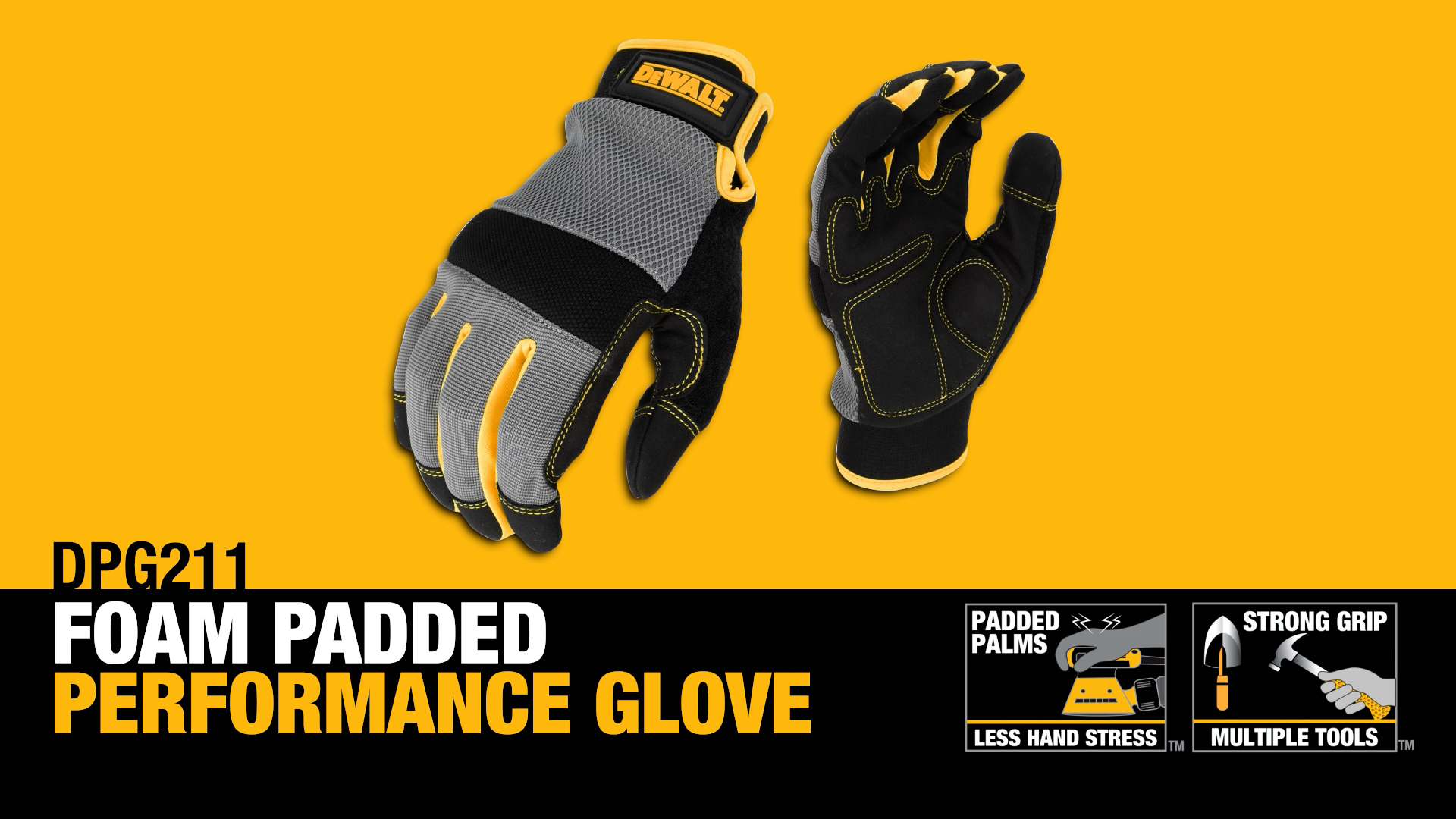 The DEWALT DPG211 Foam Padded Performance Glove protects against hand fatigue when working on jobs such as machinery repair, wooden structure installation, or digging through gravel and rock. Foam padding on palms and knuckles cushions hands from tool use, while synthetic leather fingertip overlays provide a strong grip and abrasion resistance. Double stitching and thumb saddle provides added durability.