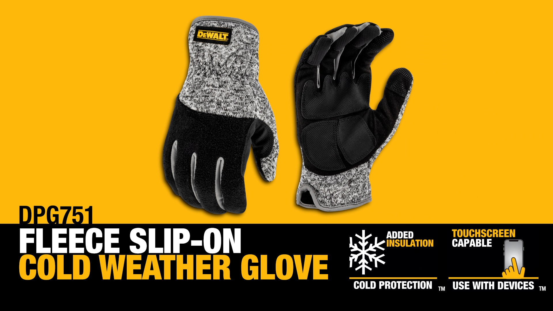 The DEWALT DPG751 Fleece Slip-On Cold Weather Glove features a synthetic leather palm and is designed for mild conditions. The anti-slip PVC palm overlays provide grip and abrasion resistance. The slip-on cuff is comfortable for all-day wear and easy to pull on and off. Touchscreen capabilities in the fingertips and fleece lining help protect from the cold. Reinforced palm patches and thumb saddles add durability and protection.